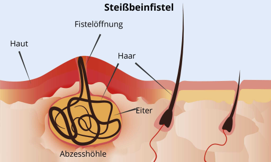 Zu den chirurgisch therapiepflichtigen Erkrankungen der Haut zählt auch die chronische Steißbeinfistel (Pilonidalsinus) sowie der akute Pilonidalabszess. Je nach Befund kommen unterschiedliche Operationsmethoden infrage. Gemeinsam entscheiden wir, ob eine minimalinvasive oder eine radikale Versorgung sinnvoll ist – unter Berücksichtigung der jeweiligen Vor- und Nachteile.